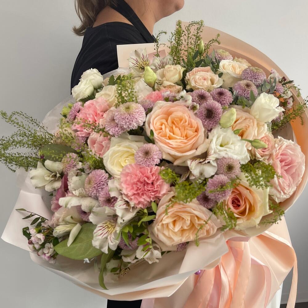роза охара пионовидная – 11 шт.Кустовая роза – 11 шт.Сантинии – 11 шт.эустома белая – 3 шт.Гвоздика сортовая – 11 шт.Альстромерия – 11 шт.Зелень – 10 шт.Тишью белое – 2 шт.Фоамиран – 2 шт.Лента – 2 шт.