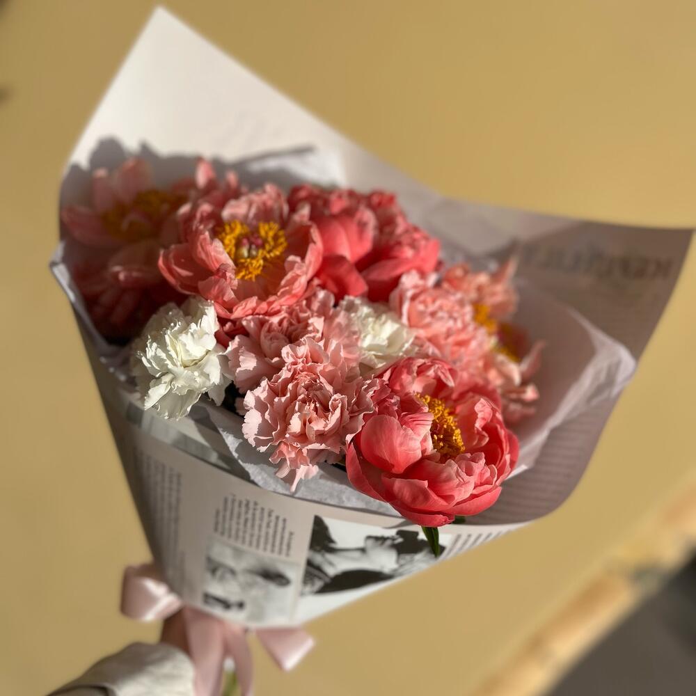Гвоздика – 6 шт.Пион коралл шарм – 5 шт.Дизайнерская упаковка – 1 шт.