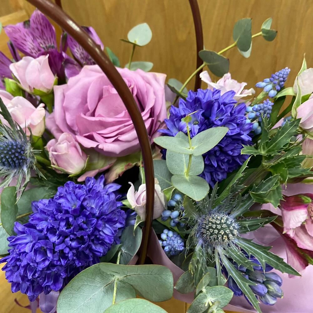 Сумка крафт – 1 шт.Оазис флористический – 1 шт.Роза – 1 шт.Роза кустовая – 2 шт.Альстромерия – 2 шт.Эвкалипт – 6 шт.