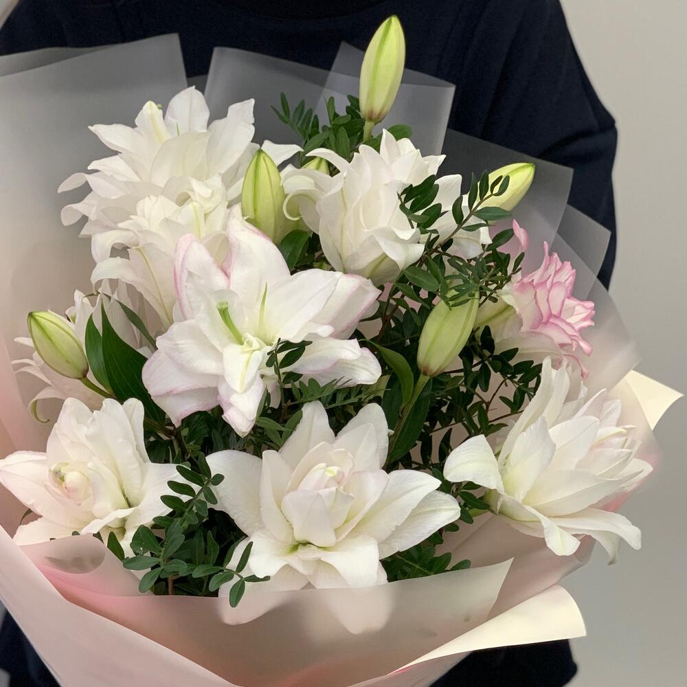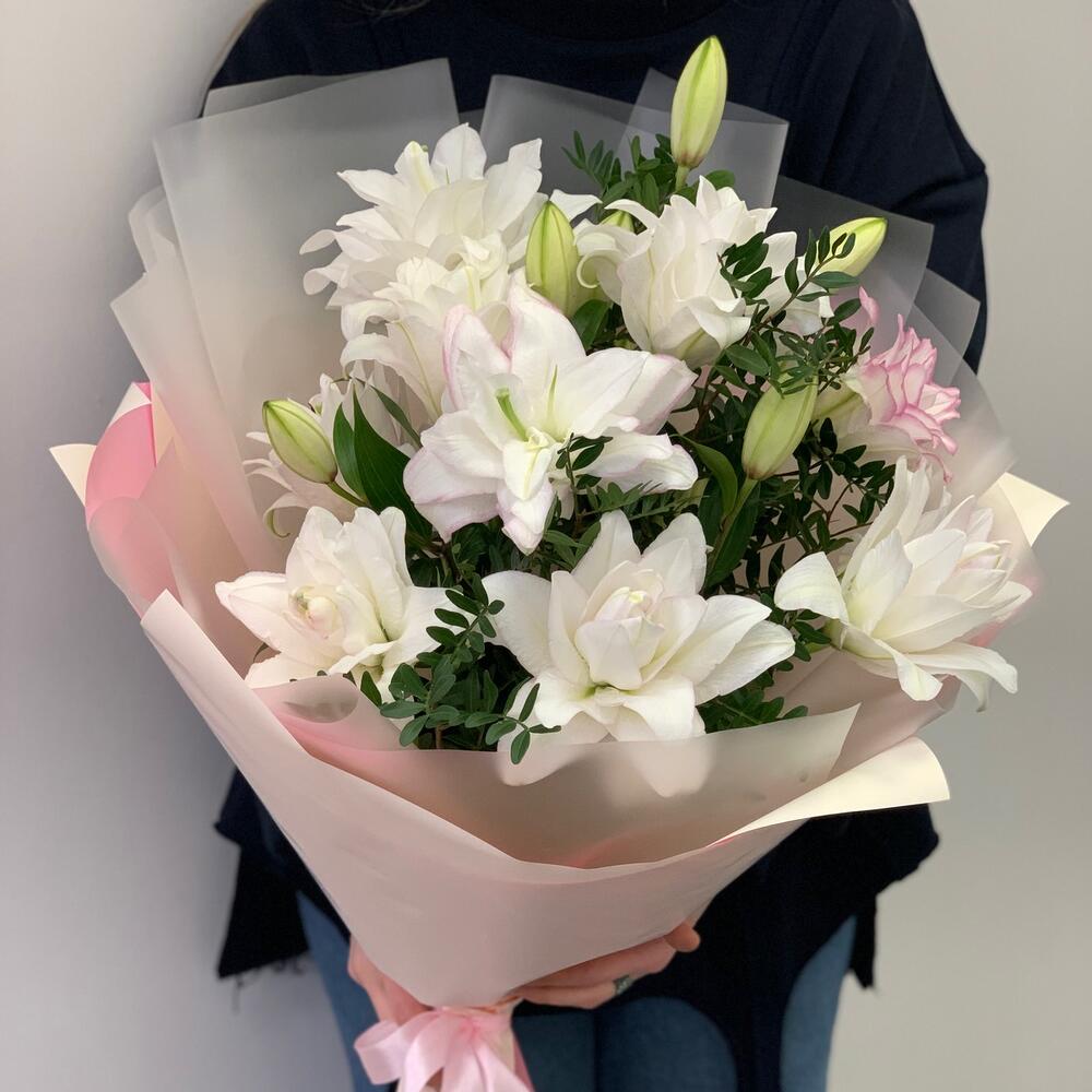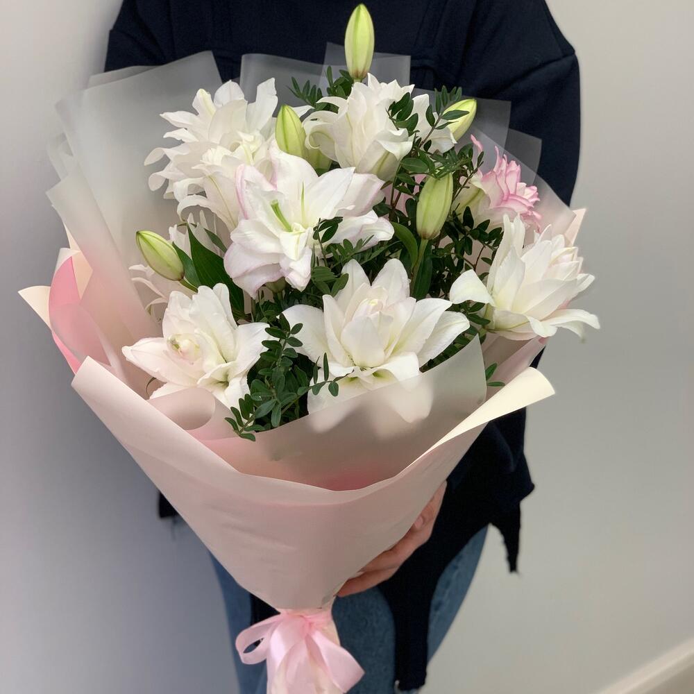 Лилия – 5 шт.Зелень – 3 шт.Дизайнерская упаковка – 2 шт.Атласная лента – 1 шт.