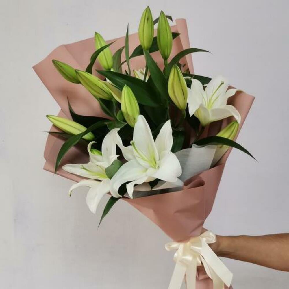 Лента – 1 шт.Пленка – 2 шт.Лилия белая – 5 шт.