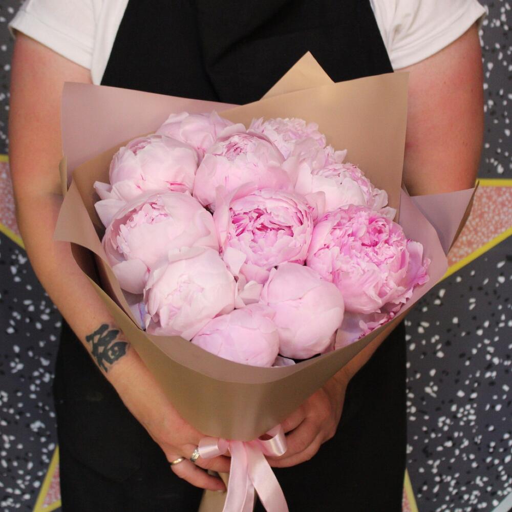 Лента атласная – 1 шт.Пион Сара Бернар – 11 шт.Пленка дизайнерская – 3 шт.