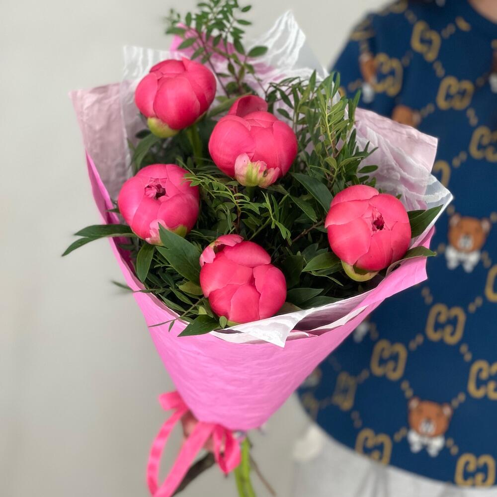 5 коралловых пионов с зеленью и оформлением