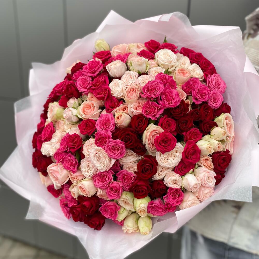 Букет из 41 ветки кустовых роз разных сортов . Количество бутонов(роз) в букете может достигать 281 штуку.
