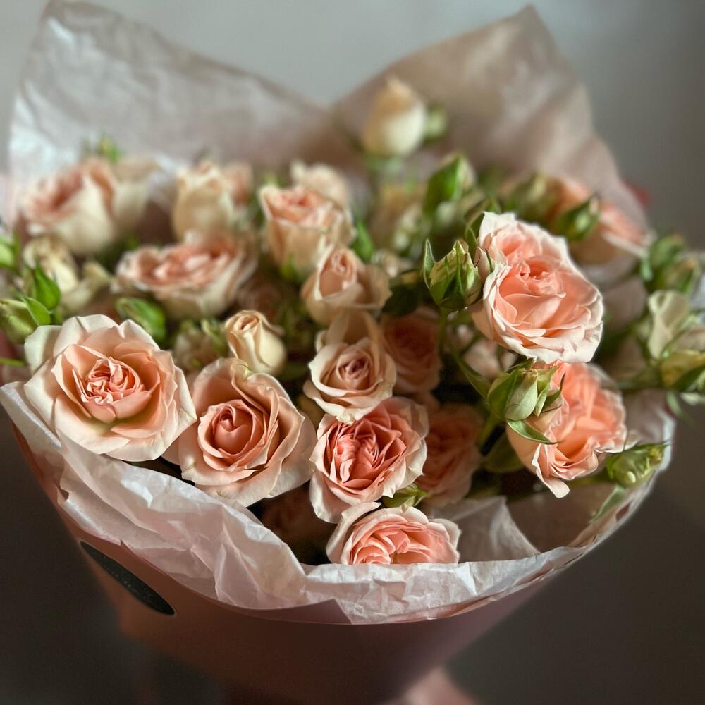 Кустовая роза – 7 шт.декоративная упаковка – 1 шт.Атласная лента – 1 шт.
