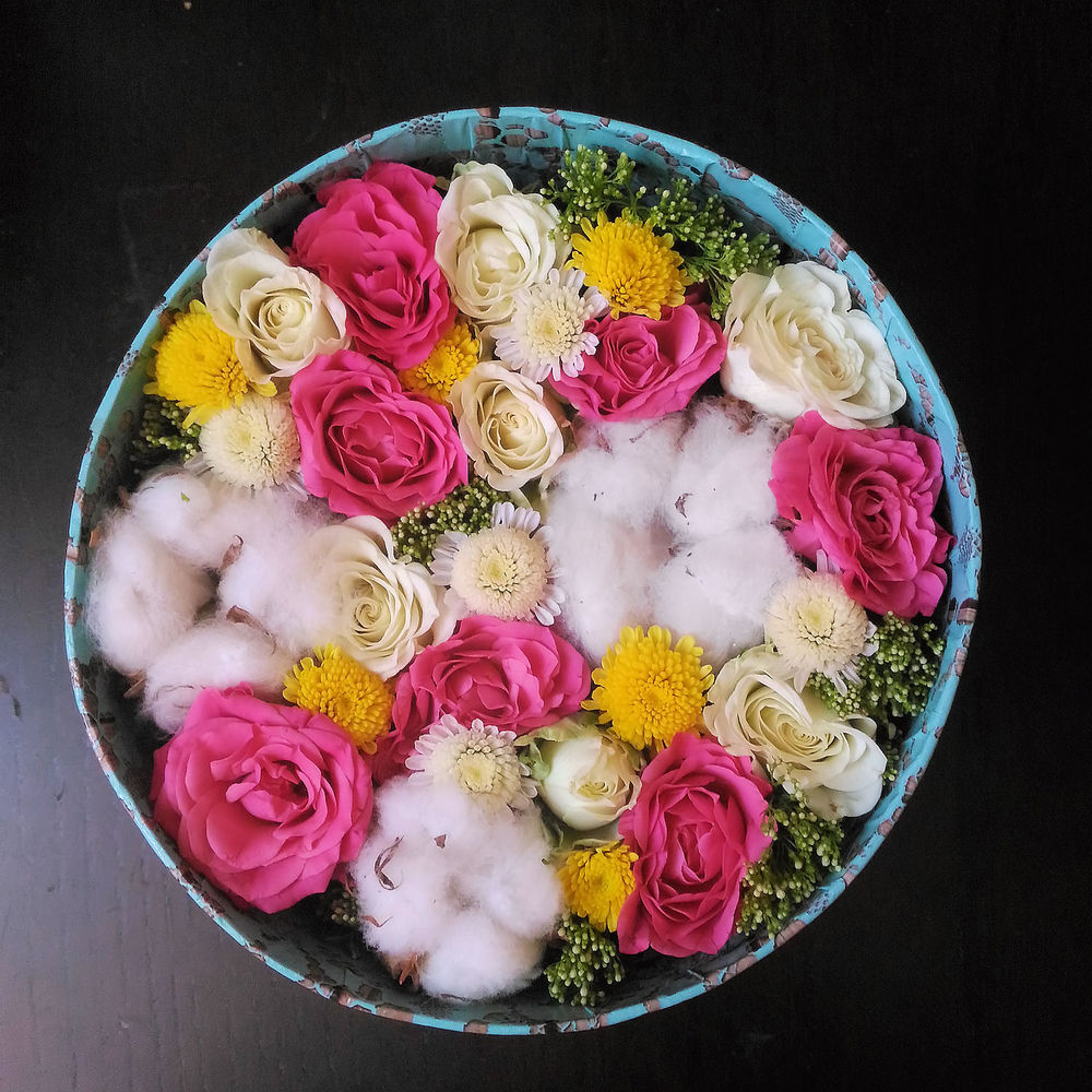 Роза розовая – 7 шт.Роза белая – 7 шт.Хлопок – 3 шт.Хризантема кустовая белая – 2 шт.Трахелиум – 2 шт.Коробка – 1 шт.Хризантема желтая кустовая – 2 шт.
