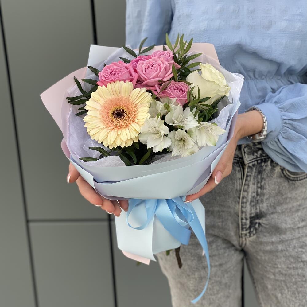 Альстромерия – 1 шт. Писташ – 2 шт. Оформление – 1 шт. герберы – 1 шт. кустовая роза артезия – 1 шт.