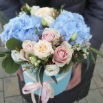 Цилиндр с гортензией, эустомой и кустовой розой
