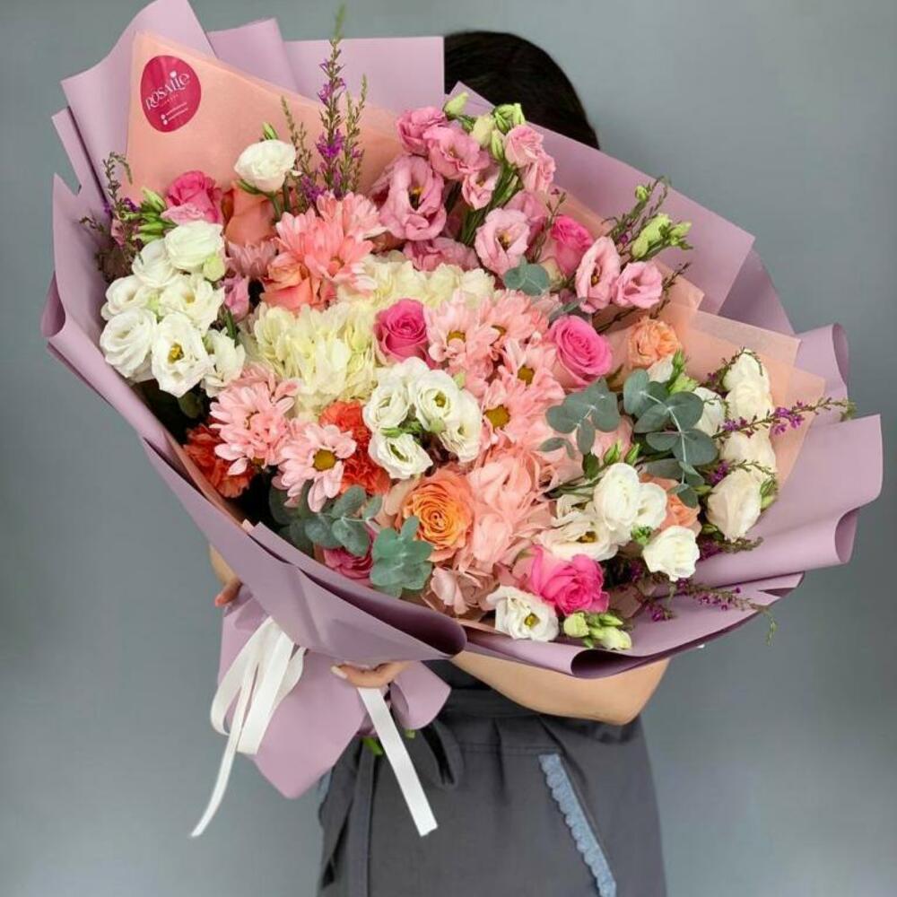 Альстромерии, Гвоздики, Кустовые розы, Лизиантусы, Розы, Хризантемы