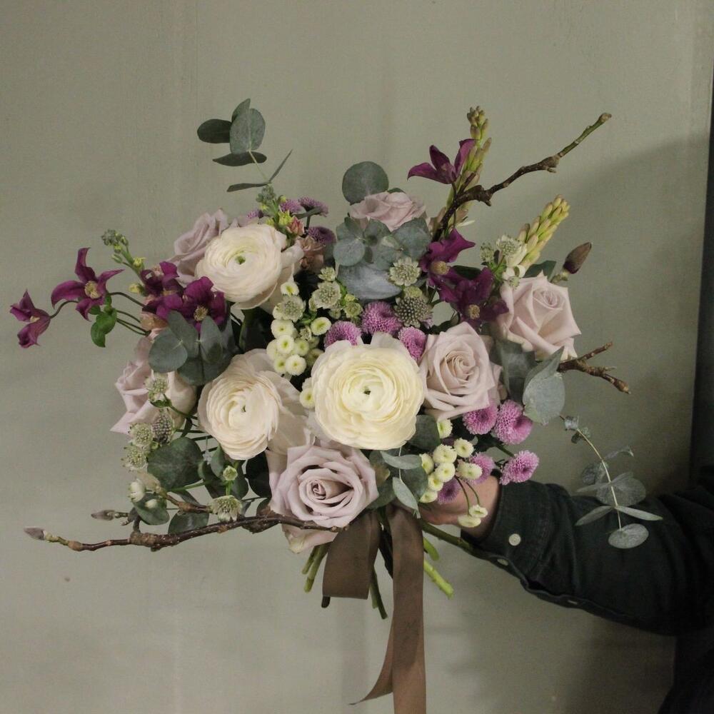Букет с характером и душистым нежным составом, ветки, ранункулюсы, клематис, тубероза, сантини, эвкалиптом, розами и астранцией.