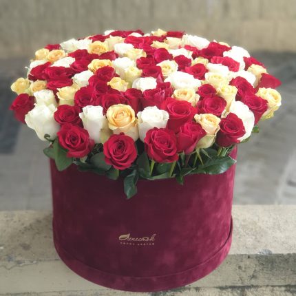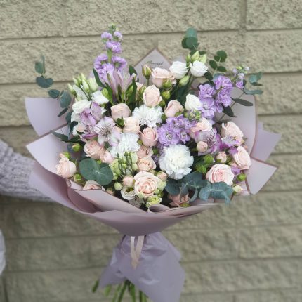 Бархатный цилиндр из голубых диантусов, розовых пионов и ароматной маттиолы